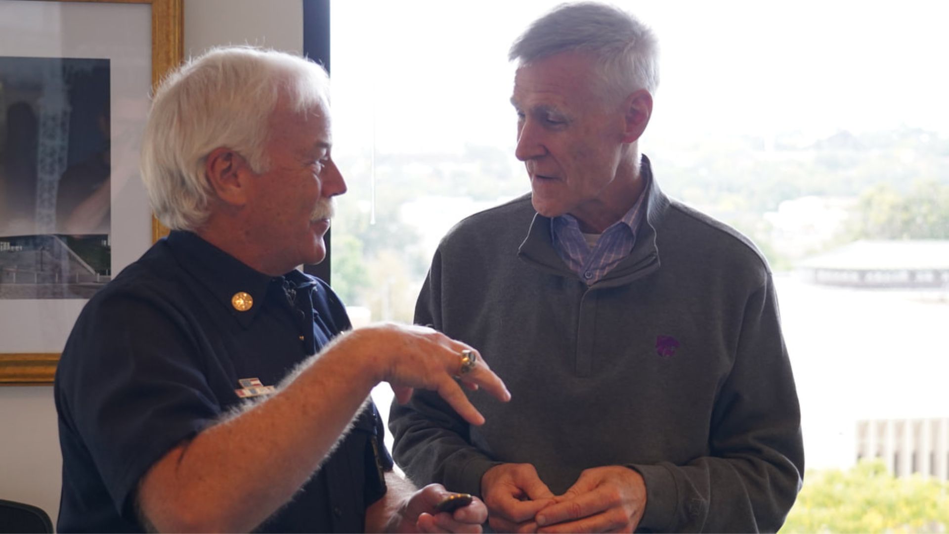The Fire Foundation of Colorado Springs wants to thank Jim Johnson for his generous support. The photo is a picture of CSFD Fire Chief Randy Royal presenting GE Johnson Construction CEO, Jim Johnson with a “Chief’s Challenge Coin”.